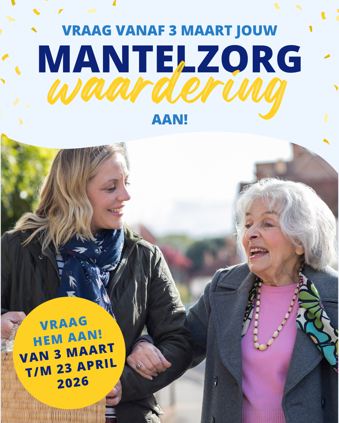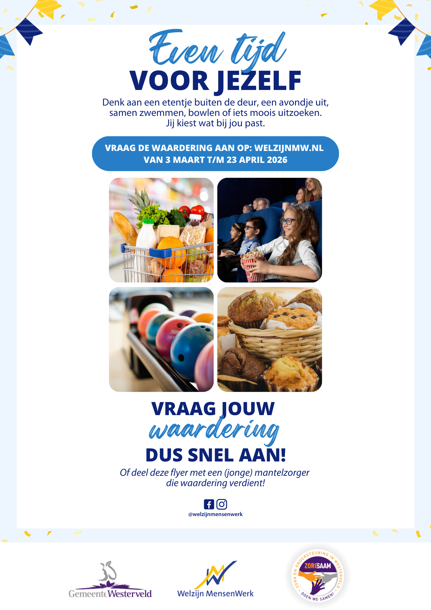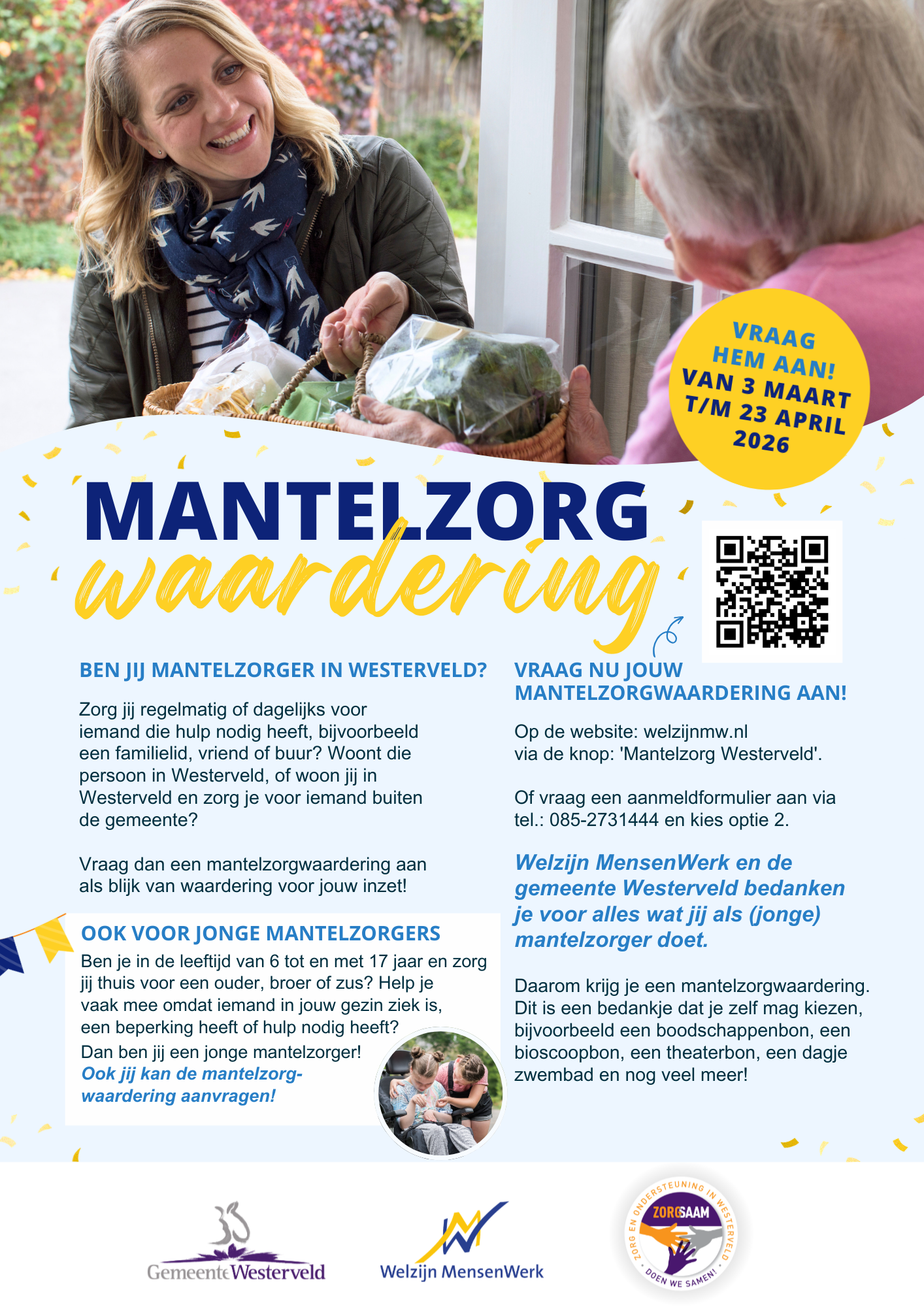 Bij Welzijn MensenWerk en de gemeente Westerveld waarderen we alles wat jij doet voor een ander. Daarom starten we van 3 maart t/m 23 april 2026 weer met de Mantelzorgwaardering!