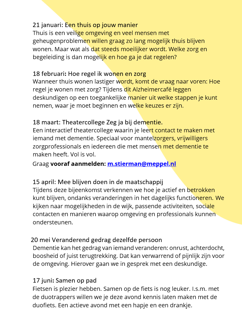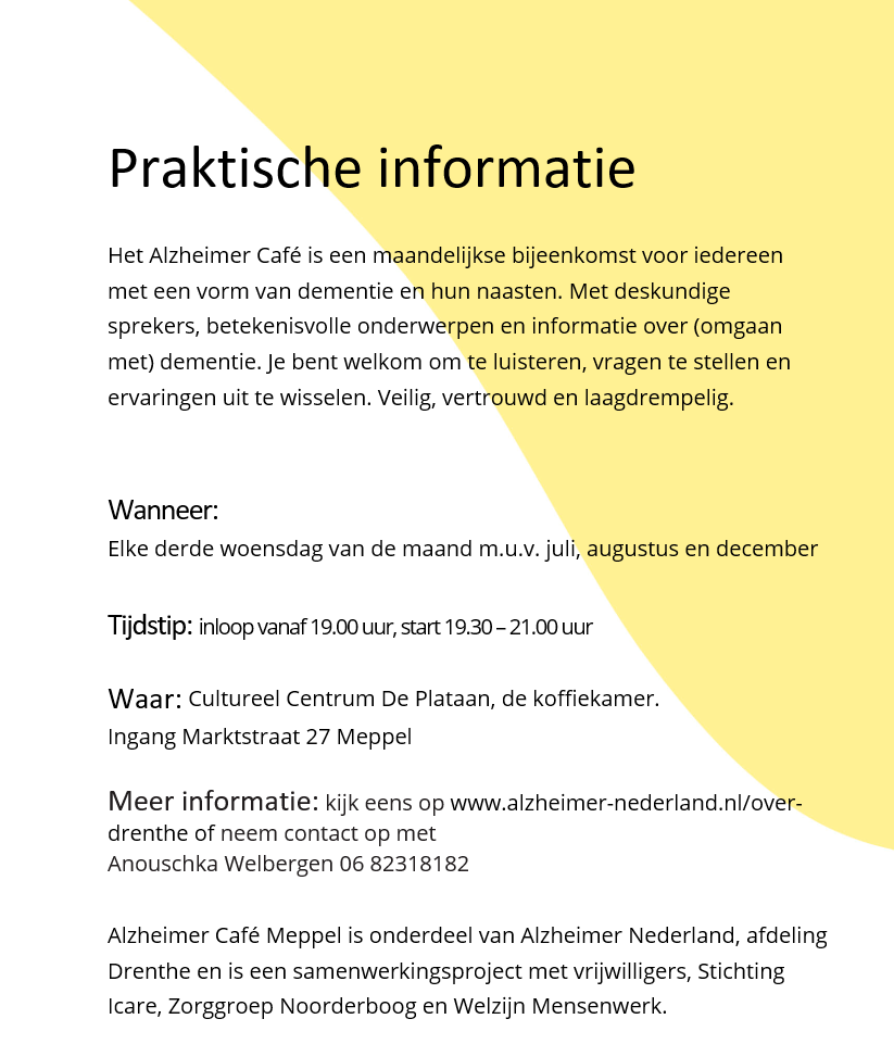 Meer over IntermeZZoBij IntermeZZo Zwolle ben je elke werkdag, zonder afspraak en zonder verwijzing, van harte welkom! Bij IntermeZZo kun je je verhaal kwijt. Vrijwilligers bieden een luisterend oor, zowel in de huiskamer als in de tuin. De gastvrouwen en -heren zijn getraind om te luisteren, zo veel en vaak als je nodig hebt. Alleen of samen met je naaste kun je binnenlopen wanneer jij dat wilt.